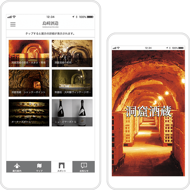 お酒を貯蔵している、洞窟酒蔵の見学に使用できる多言語対応の音声ガイドアプリです。